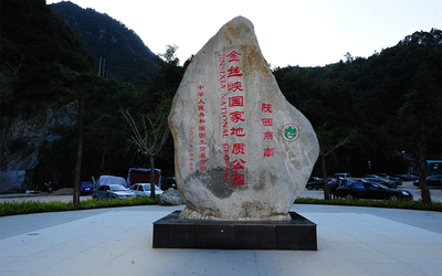 陆督门,面前的广场叫做地质广场,中间这块刻着“金丝峡国家地质公园”字样的石头就是金丝峡的又一个身份象征。地质广场的命名主要与金丝峡地质公园的身份有关系。金丝峡是第五批国家地质公园,丰富的地质遗迹资源多形成于大约一亿年前的南秦岭构造带的造山运动。